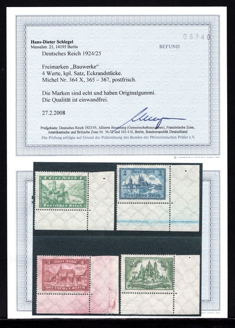 Deutsches Reich MiNr. 364-367 Eckrand ur postfrisch Fotobefund Schlegel