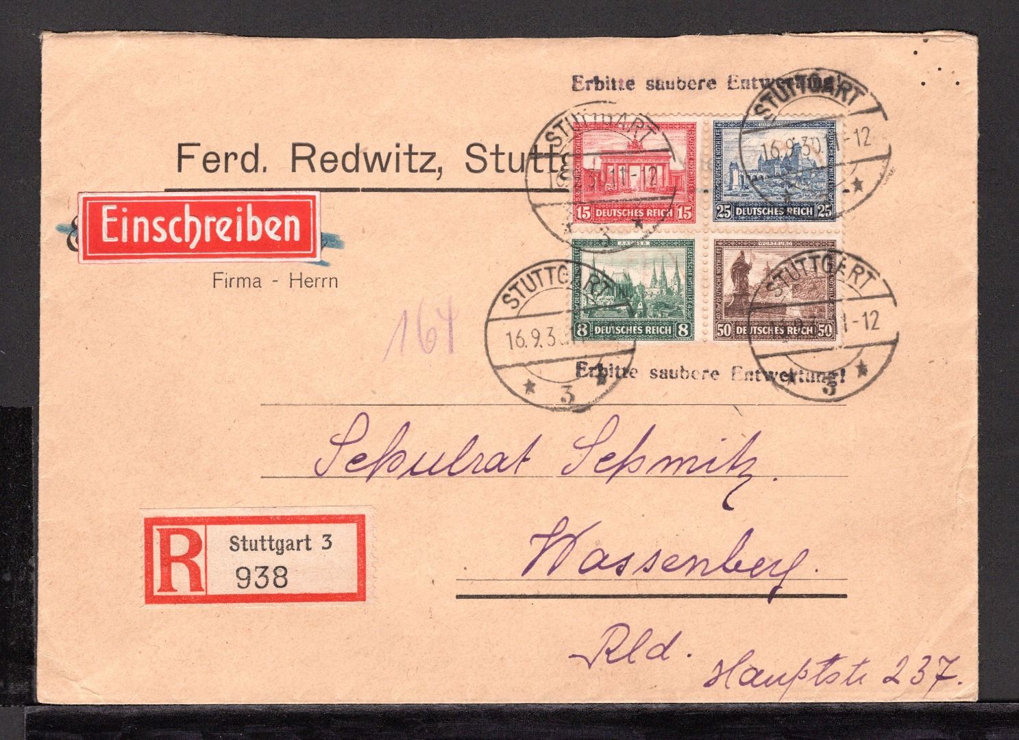Deutsches Reich MiNr. 446-449 R-Brief gestempelt auf Brief