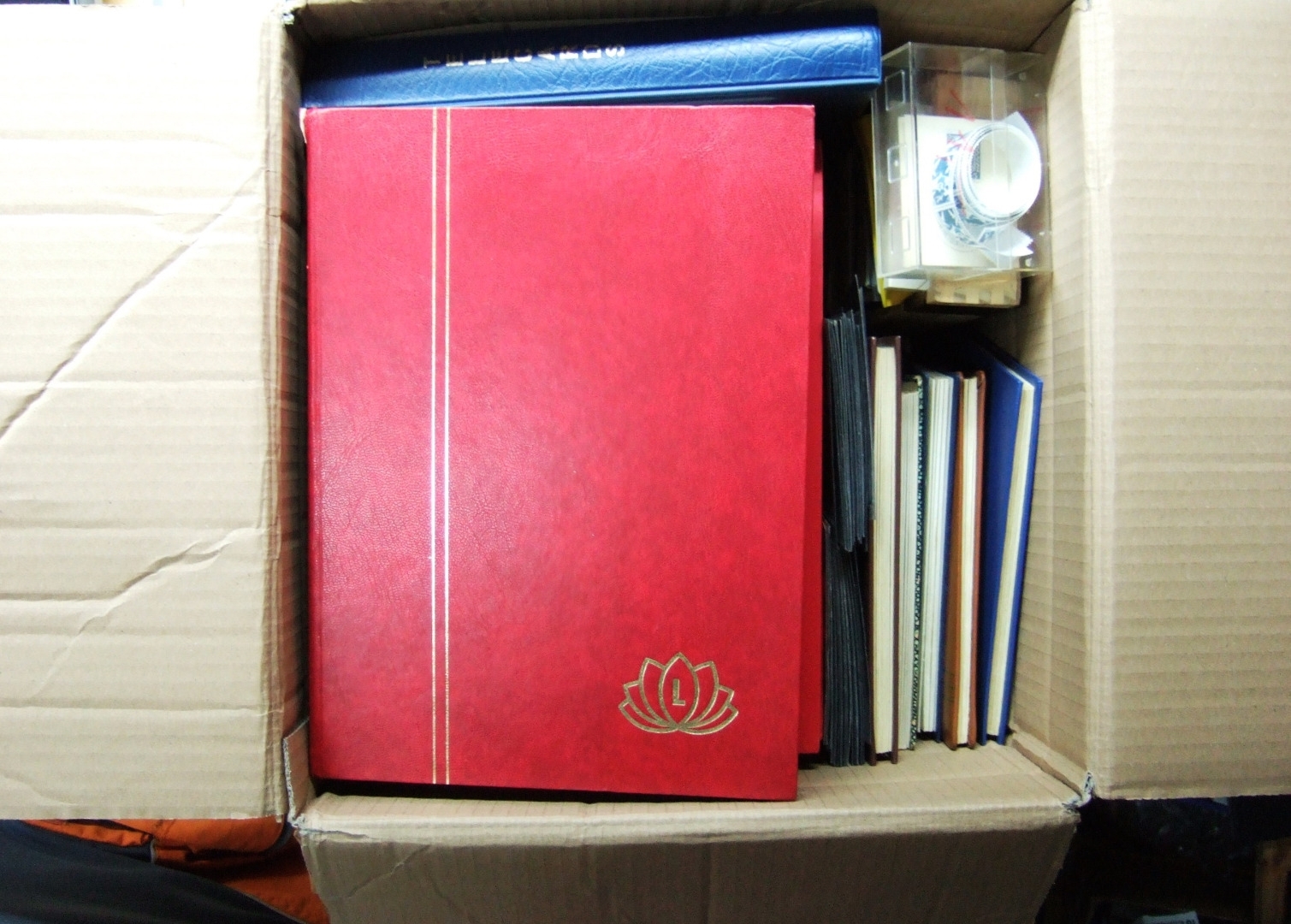 Die Kisten sind 33x33x33 cm groß und gut gefüllt mit Briefmarken auf Steckkarten und/ oder in Tüten, auf Vorducken und/oder in Steckbüchern sowie Briefen und Belegen, etwas Zubehör,