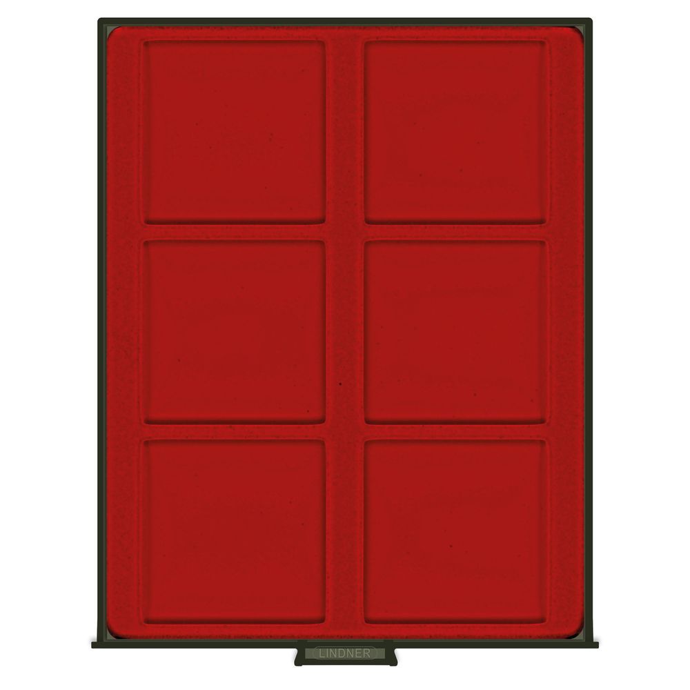 Dunkelrote Einlage mit 6 quadratischen Fächern 85x85 mm/Max. Füllhöhe: 18,5 mm.