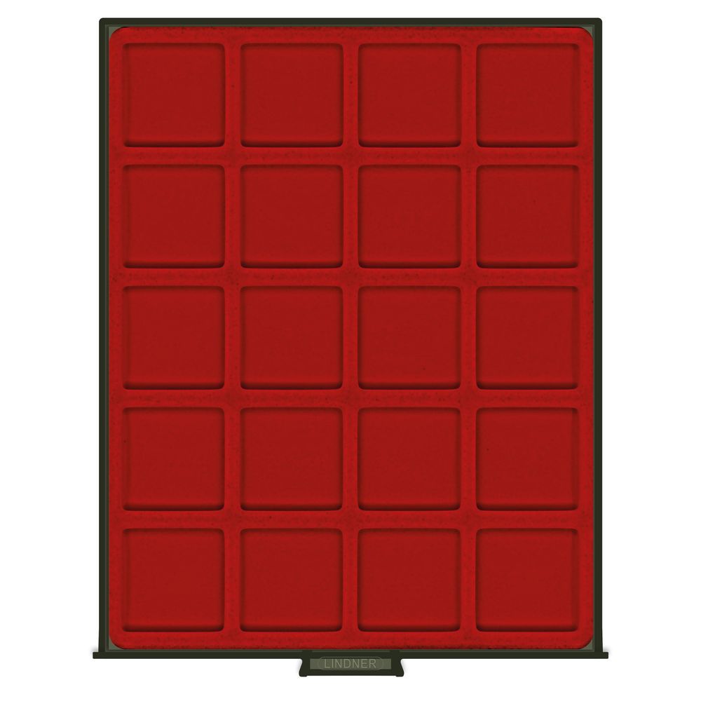 Dunkelrote Einlage mit 20 quadratischen Fächern 47x47 mm/Max. Füllhöhe: 18,5 mm.