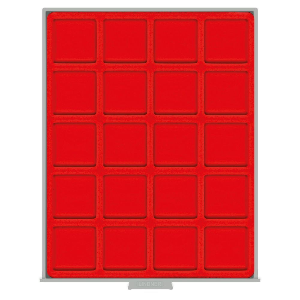 Hellrote Einlage mit 20 quadratischen Fächern 47x47 mm/Max. Füllhöhe: 18,5 mm.