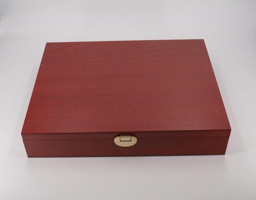Echtholz Münzkassette mit 5 schwarzen Münztableaus mit je 24 quadratischen Fächern.