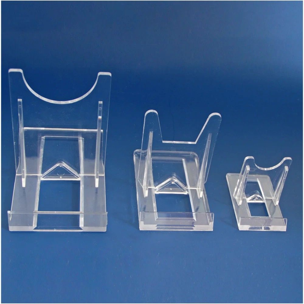 Diese Ständer aus hochtransparentem Kunststoff lassen sich in der Länge verstellen, so dass sie für die verschiedensten Sammlerstücke passen.
