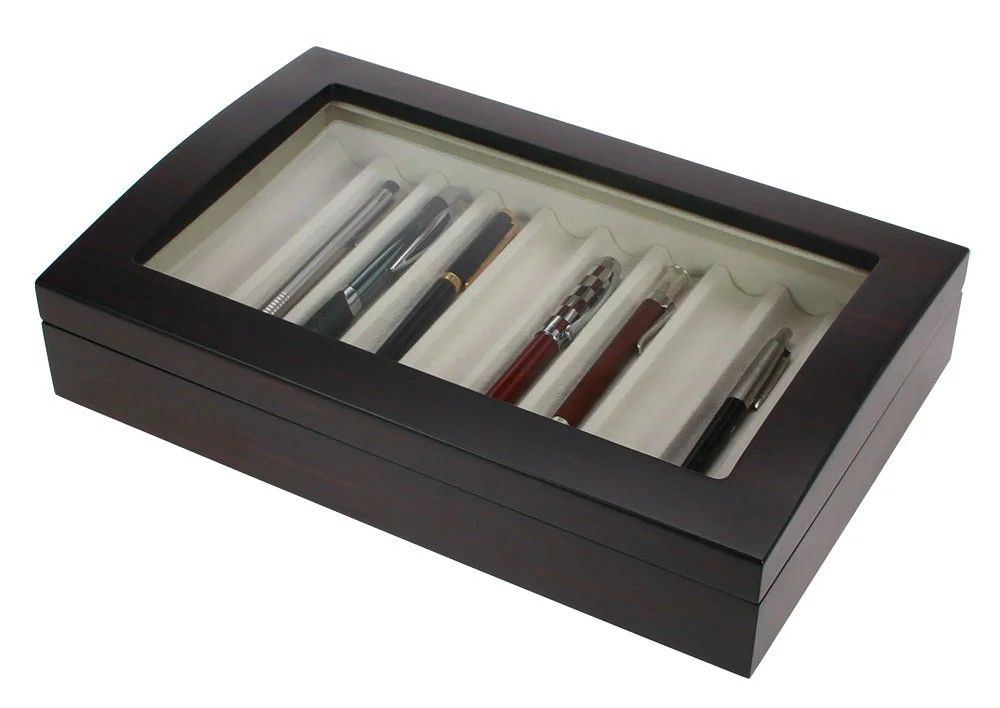 Edle Vitrine für Schreibgeräte aus Holz mit Magnetverschluss.