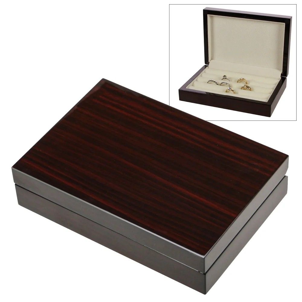Schön verarbeiteter Schmuck-Kasten für Ringe, Manschettenknöpfe und Ohrringe. Innen Velours, außen hochglänzende Oberfläche. Maße: 180 x 125 x 46 mm Lieferung ohne Inhalt!