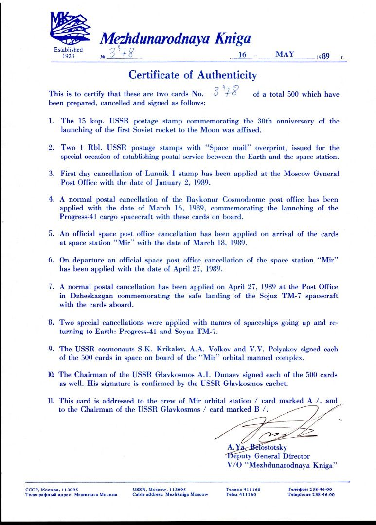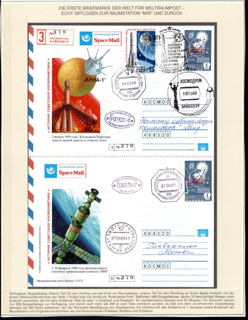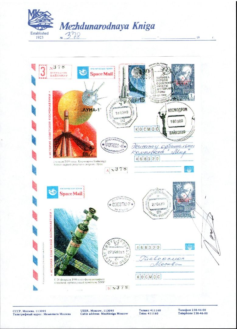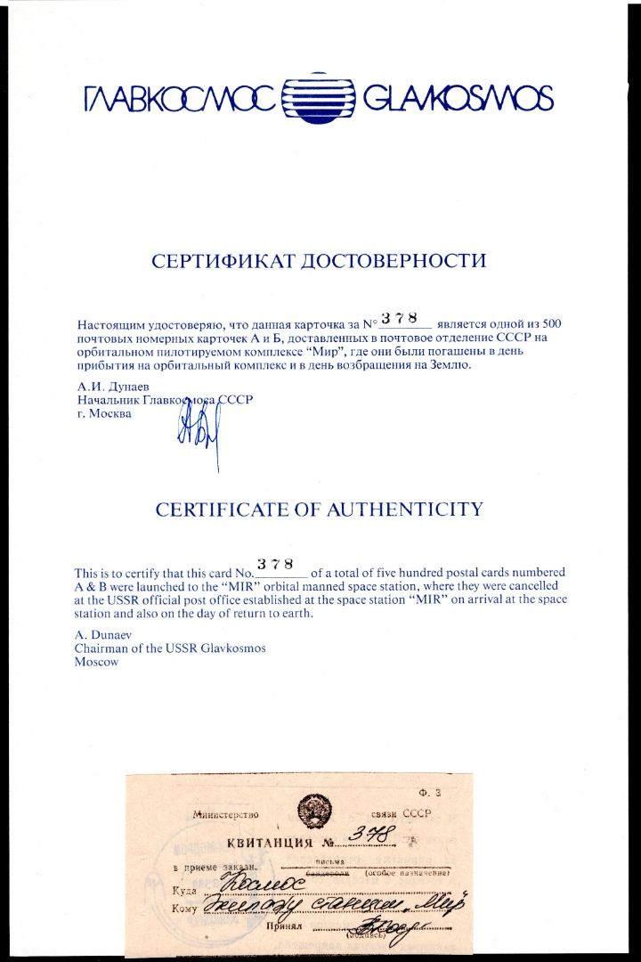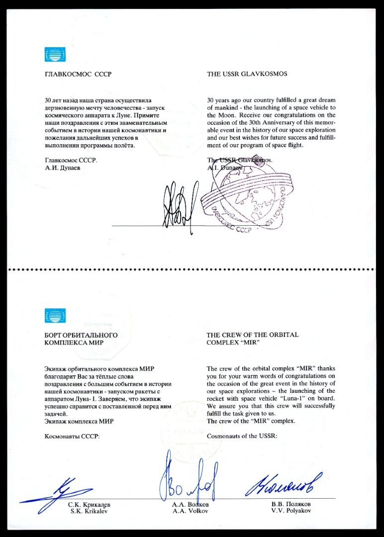 Autogramme von Krikalew, Wolkow und Poljakow. Doppelbeleg Nr. 378 zertifiziert